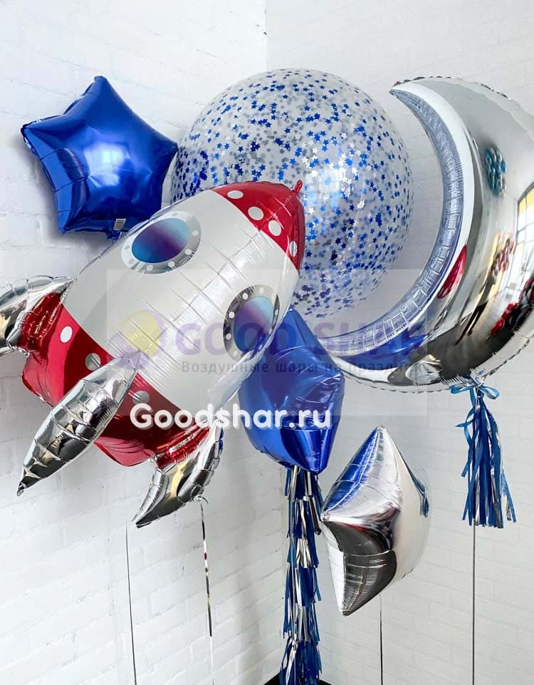 Набор с большой ракетой, полумесяцем, звёздами и шаром-гигантом с конфетти отлично подойдет для дня рождения, детского праздника или тематической вечеринки.