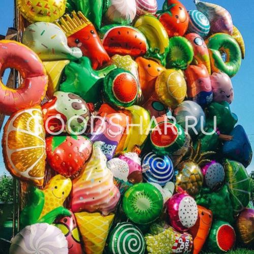 - Композиция из 50–55 фольгированных фигурных шаров в сочной летней гамме.