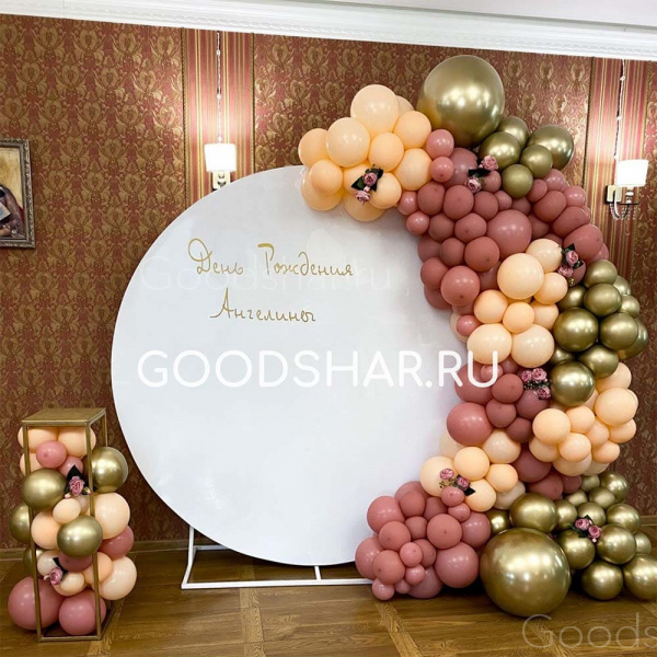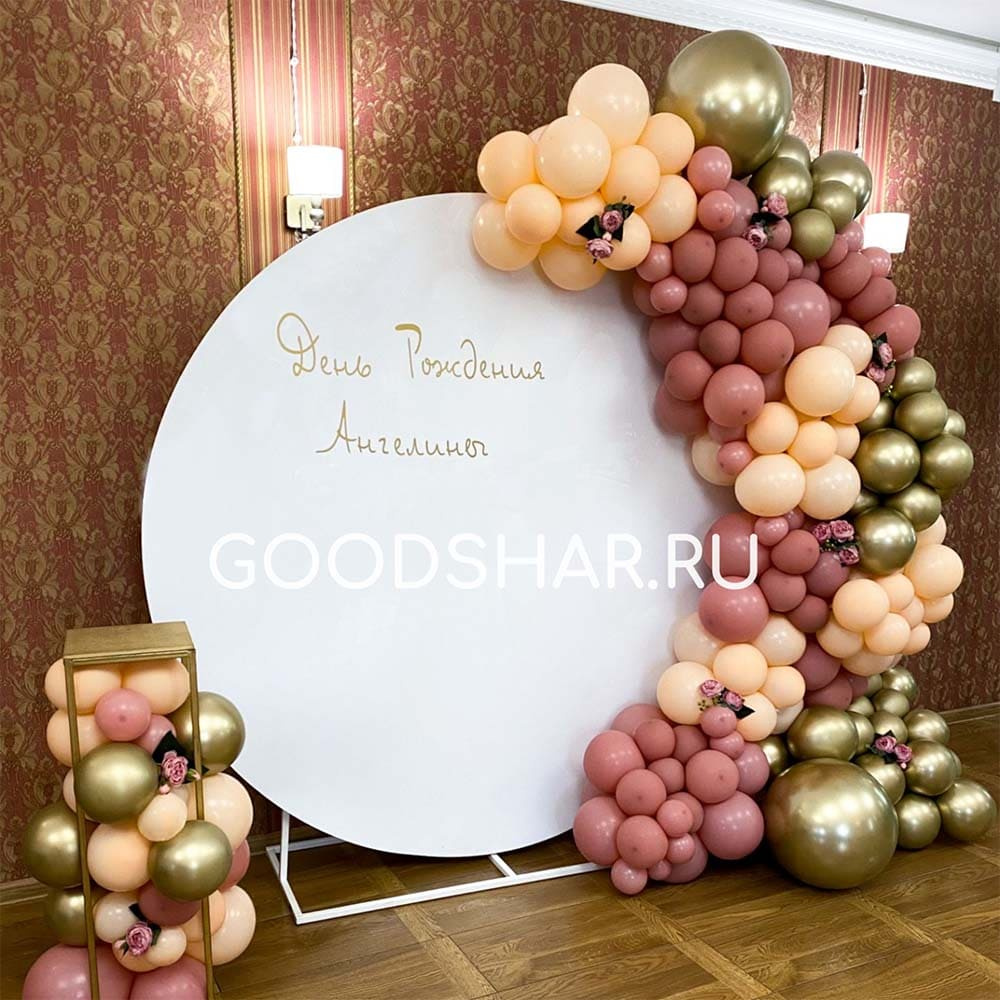 Баннер круг с индивидуальной надписью, шарики латексные в цвете пастель и хром, стойка с шарами.