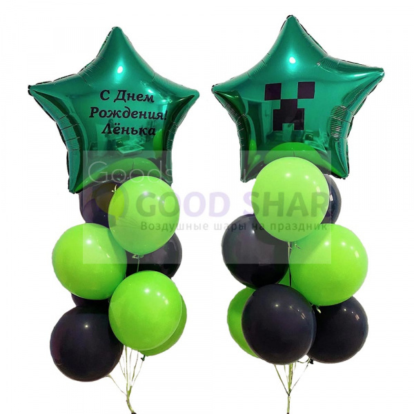 Масштабная композиция для настоящего фаната Minecraft. Два больших фольгированных шара с персонализированными рисунками или надписями в окружении классических латексных шаров создают атмосферу любимой игры. Идеально для дня рождения или тематической вечеринки.