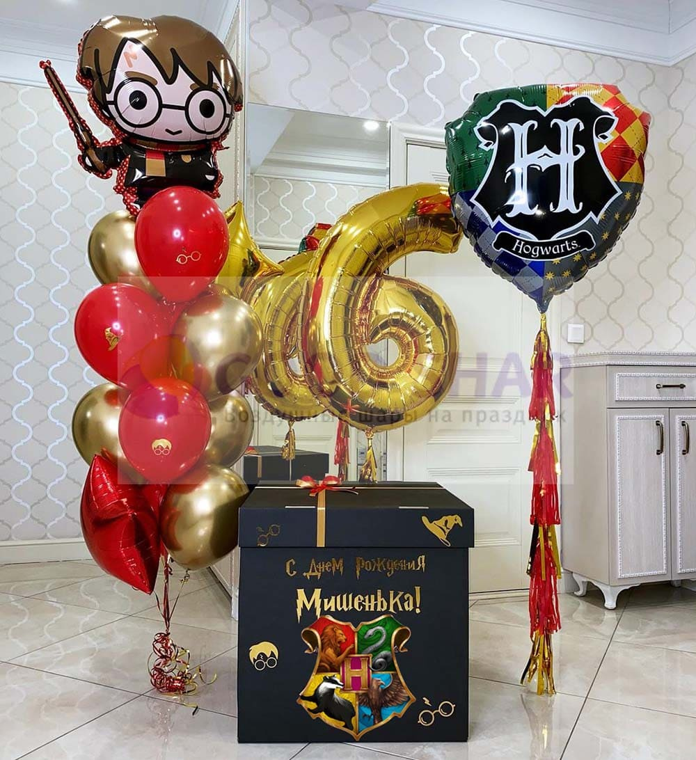 Этот набор — настоящее магическое приключение. Яркая коробка с индивидуальной надписью, открыв которую, именинник увидит парящие тематические шары с символами Хогвартса и главным героем. Идеальный подарок на день рождения, выпускной или тематическую вечеринку.