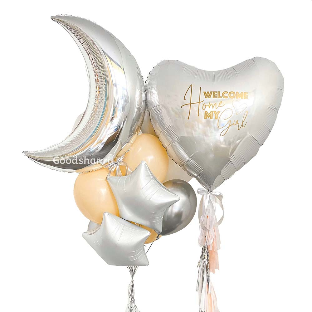 Нежный и сказочный набор для торжественной выписки маленькой принцессы. Фольгированное сердце с посланием и хвостом, волшебный месяц и сияющие акценты создают лёгкую, воздушную атмосферу для первого праздника малышки.