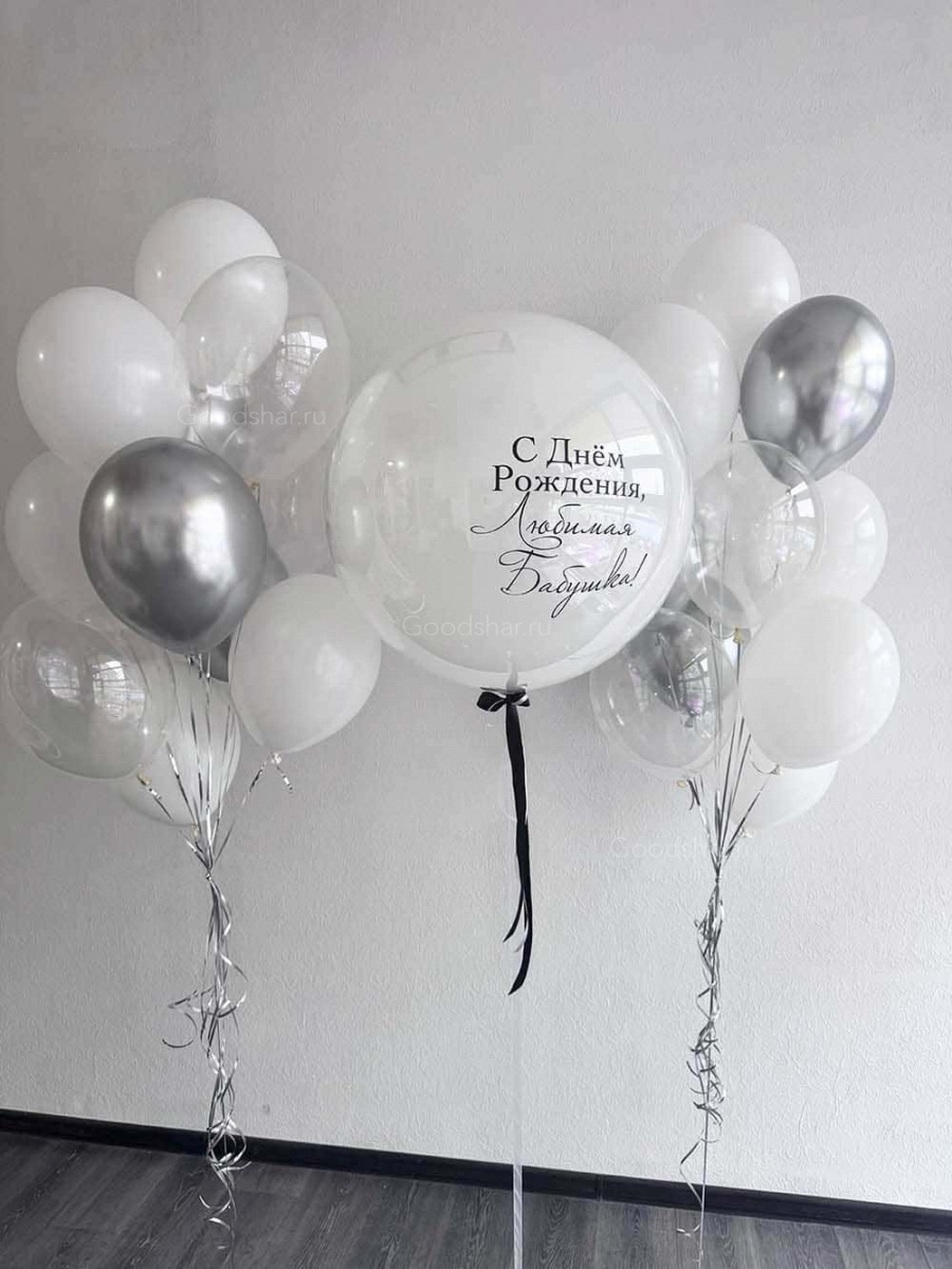 Нежный и светлый набор в белом, прозрачном и серебряном — для самой любимой бабушки. В центре композиции — стеклянный шар с индивидуальной надписью, которая скажет самые тёплые слова благодарности и любви. Два объёмных фонтана создают праздничное настроение: хромовые шары добавляют сияние, прозрачные — воздушность и лёгкость, а матовые — нежность и уют. Подарок для бабушки, которая заслуживает только самого лучшего.
