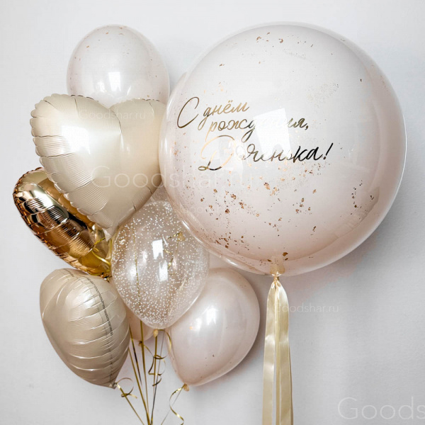 Светлая и трогательная композиция, созданная для того, кто по-настоящему дорог. В центре внимания — стеклянный шар-гигант бежевого цвета с наполнением и индивидуальной надписью, который станет главным посланием и хранителем самых важных слов. Объемный фонтан из золотых и бежевых сердец, мерцающих шаров с конфетти и нежных шаров Дабл стафф с наполнением создает атмосферу тепла, света и благодати. Идеальный выбор для дня рождения, юбилея или любого события, где хочется сказать человеку: «Ты — наш ангел».