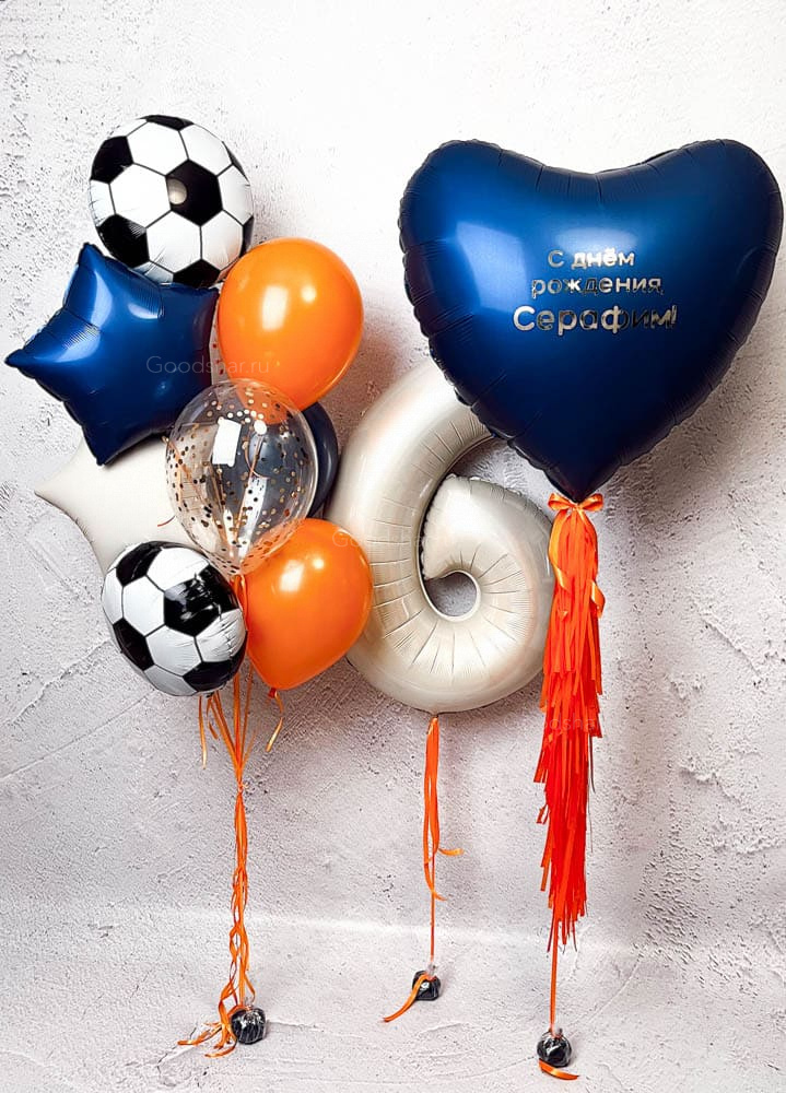 Вдохновляющий набор в футбольной стилистике для юного чемпиона, который только начинает свой путь к славе. В центре внимания — синее фольгированное сердце-гигант с индивидуальной надписью, которое становится главным посланием и символом любви и поддержки. Фольгированная цифра 6 подчеркнёт важную дату, а объёмный фонтан из 10 шаров создаёт динамичную композицию: футбольные мячи, звёзды побед и сочные цвета футбольного поля — белый, синий, оранжевый — дополняют образ яркими эмоциями и спортивным настроением. Идеальный выбор для дня рождения юного футболиста, выписки из роддома или любого события, где начинается путь к большим победам.