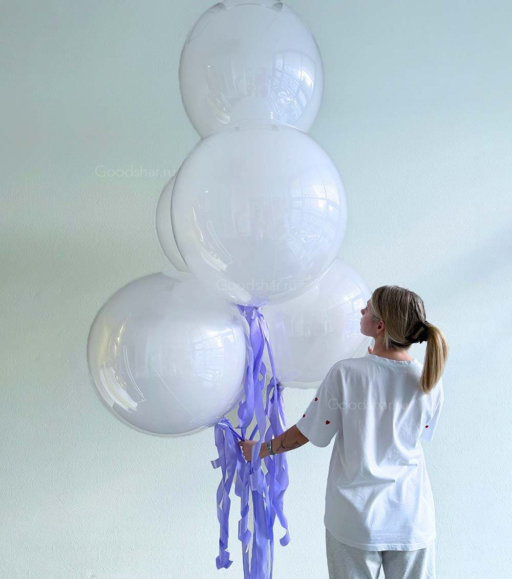 Изысканная композиция из 5 прозрачных стеклянных баблсов нежного белого цвета, словно шарики нежного йогурта. Каждый шар украшен фиолетовыми атласными лентами, которые напоминают сладкий черничный соус, создавая аппетитный и стильный контраст. Прозрачные стенки баблсов позволяют любоваться воздушным наполнением, а фиолетовые ленты добавляют элегантности и завершённости. Идеальный выбор для дня рождения, детского праздника или любого мероприятия в нежных и сочных тонах.