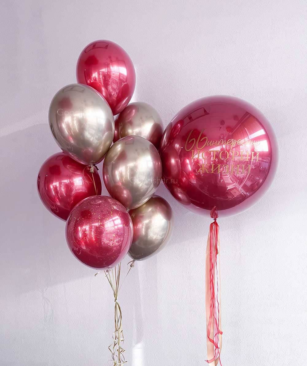 Современная и фактурная композиция для яркого праздника. Прозрачный стеклянный шар с вашим личным посланием в окружении фонтана из плотных шаров «Дабл стафф» с эффектом двойной стенки и хромированным блеском. Идеально для дня рождения, корпоратива или любого события, где нужен необычный и стильный декор.