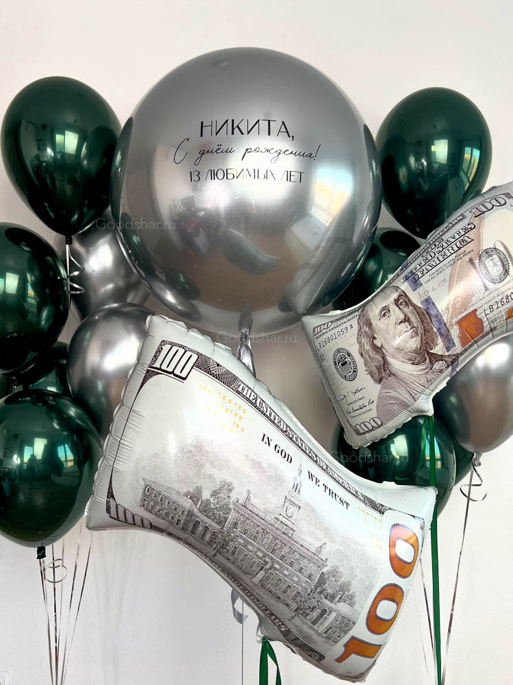 Современная композиция с шаром-гигантом с индивидуальной надписью, дополненная фольгированными шарами «Доллар» и сочетанием хромированных и даббл стафф шаров. Отличный вариант для уверенного и запоминающегося подарка.