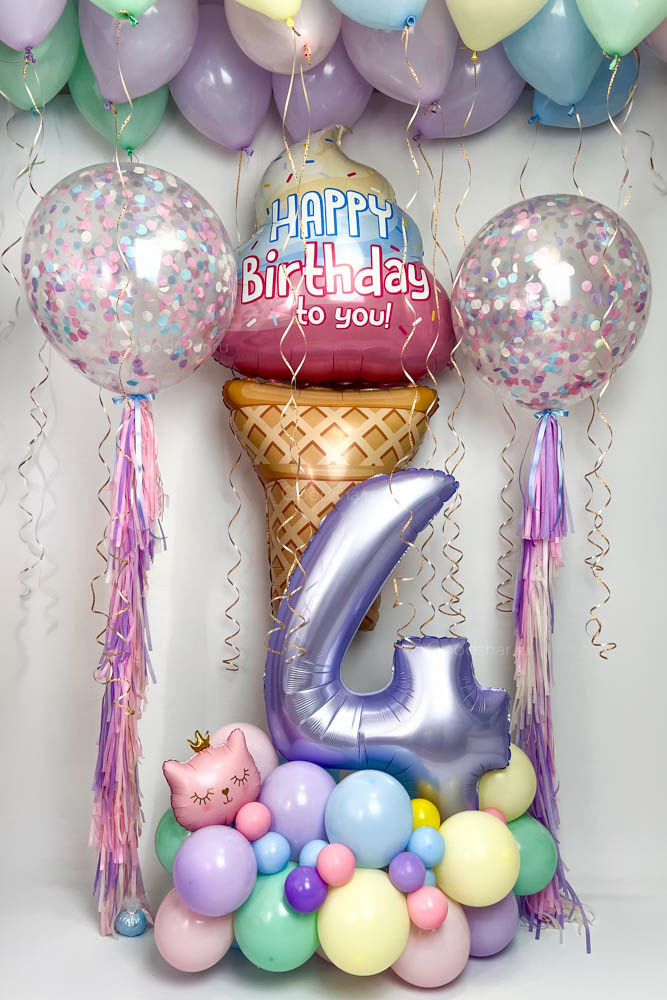 Эффектный набор с фигурной стойкой с цифрой, большим шаром в виде мороженого, декоративными бабблсами и шарами под потолок. Идеально подойдёт для детского праздника и яркой фотозоны.