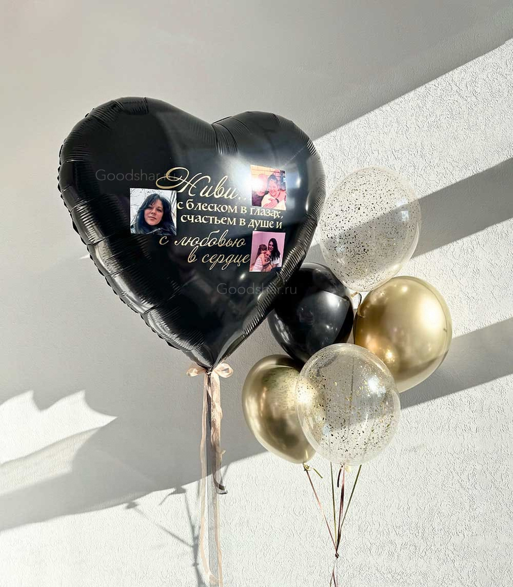 Эффектная композиция в благородном сочетании черного и золотого — для уверенной в себе девушки с безупречным вкусом. В центре внимания — гигантское фольгированное сердце с индивидуальной надписью и наклейкой, которое станет главным признанием. Объёмный фонтан из 7 латексных шаров создаёт завершённый образ: хром добавляет зеркальный блеск, шары с конфетти — лёгкое сияние, а однотонные — глубину и стиль. Подарок для той, чьё сердце бьётся в ритме страсти и свободы.