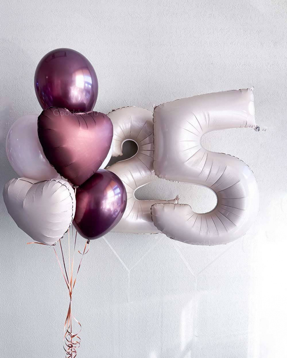 Аппетитное сочетание нежного бежевого и глубокого бургунди — словно карамель и спелая вишня в одном десерте. Фольгированные цифры напомнят о важной дате, а два сердца добавят романтичного настроения. Латексные шары без рисунка создают лёгкий и воздушный фон. Идеальный подарок для девушки, которая ценит стиль, нежность и красивые детали.