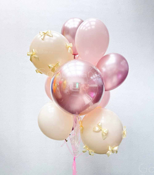 Воздушная и утончённая композиция в персиковых и нежно-розовых тонах — словно цветущая сакура, рассыпавшая свои лепестки по праздничному небу. В центре внимания — большой стеклянный шар 24", который станет главным акцентом. Два латексных шара 18" с нежными бантиками добавляют трогательности, а хромовые и матовые шары создают объём, сияние и лёгкость. Идеальный подарок для девушки, которая ценит красоту, нежность и восточную эстетику.