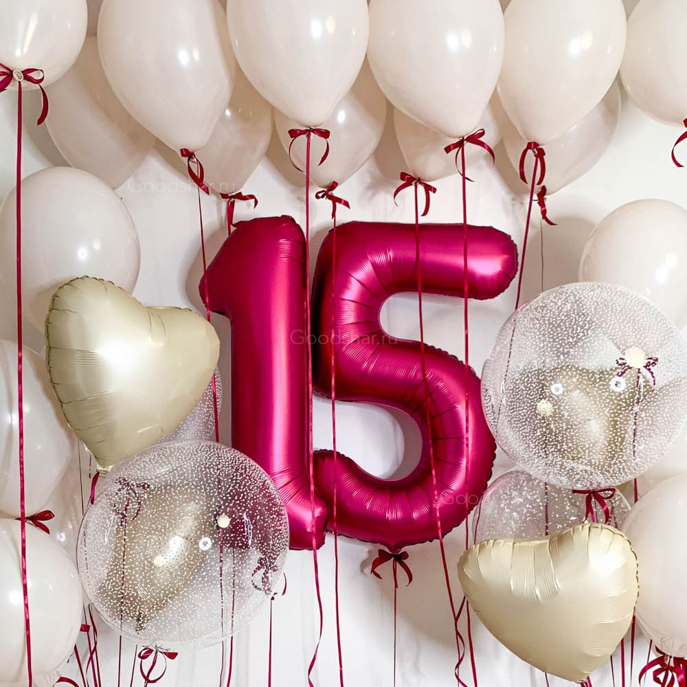 Яркий праздничный набор с фольгированными цифрами и насыщенным оформлением пространства. Шары под потолком создают атмосферу, а два воздушных фонтана с баблсами и сердцами добавляют глубину и объём композиции.