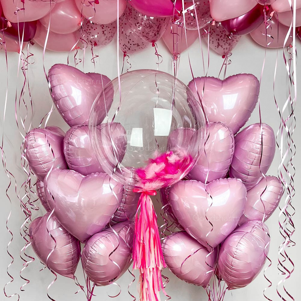 Эффектный и объёмный набор с двумя бабблс шарами с наполнением и декоративными хвостами. Композиция дополнена фольгированными сердцами и шарами под потолком, создавая атмосферу лёгкости и романтики.