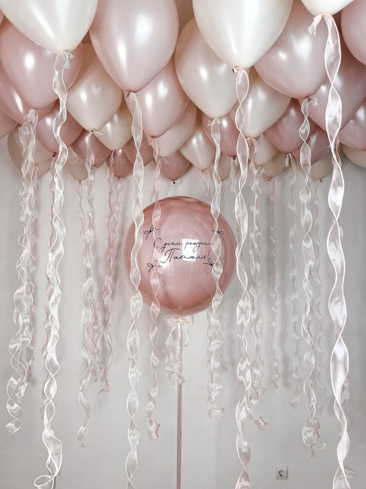 Лёгкий и эстетичный набор с большим стеклянным шаром с индивидуальной надписью и облаком латексных шаров под потолок на атласной ленте. Идеально подойдёт для дня рождения или нежного сюрприза.
