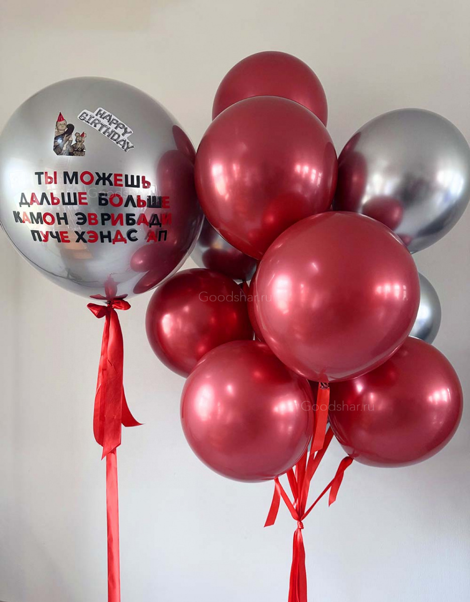 Яркая и стильная композиция в красном и серебре — для мужчины, который всегда стремится вперёд. В центре внимания — шар-гигант Хром с индивидуальной надписью, которая станет главным напутствием. Дюжина хромовых шаров 18 дюймов создаёт мощный и объёмный фон, символизируя масштаб и размах. Подарок для того, кто не останавливается на достигнутом и знает, что дальше — больше!