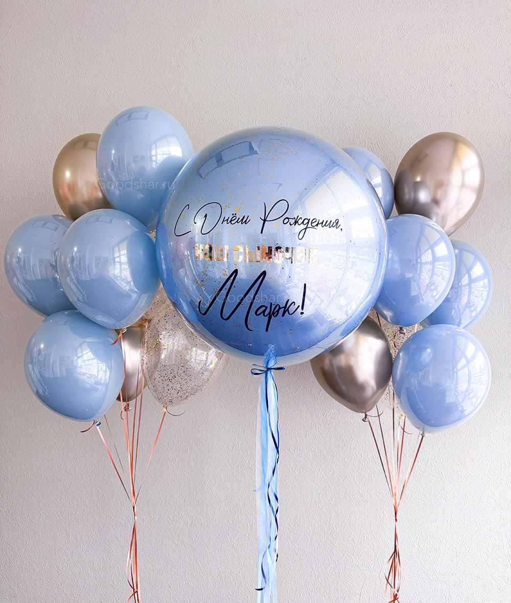 Изысканный набор в небесном голубом и сияющем золоте — для самого любимого сына. Два объёмных фонтана создают эффектную многоуровневую композицию, а стеклянный шар с наполнением и индивидуальной надписью становится её трогательным сердцем. Латексные шары Даббл стафф, хром и с конфетти добавляют объём, блеск и праздничное настроение. Подарок, который скажет «люблю» без слов.