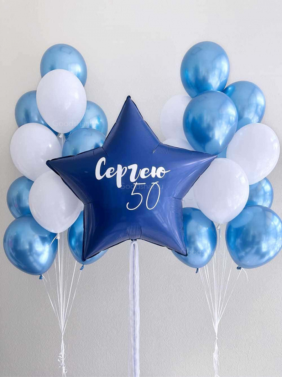 Торжественная композиция в белом и голубом — идеальное оформление для юбилея. Подарок для мужчины, чья дата заслуживает самого звёздного оформления.