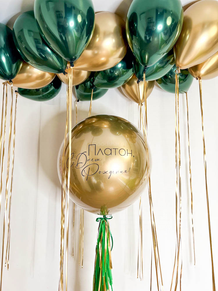 Стильное оформление в зелёно-золотой гамме с персональным шаром.