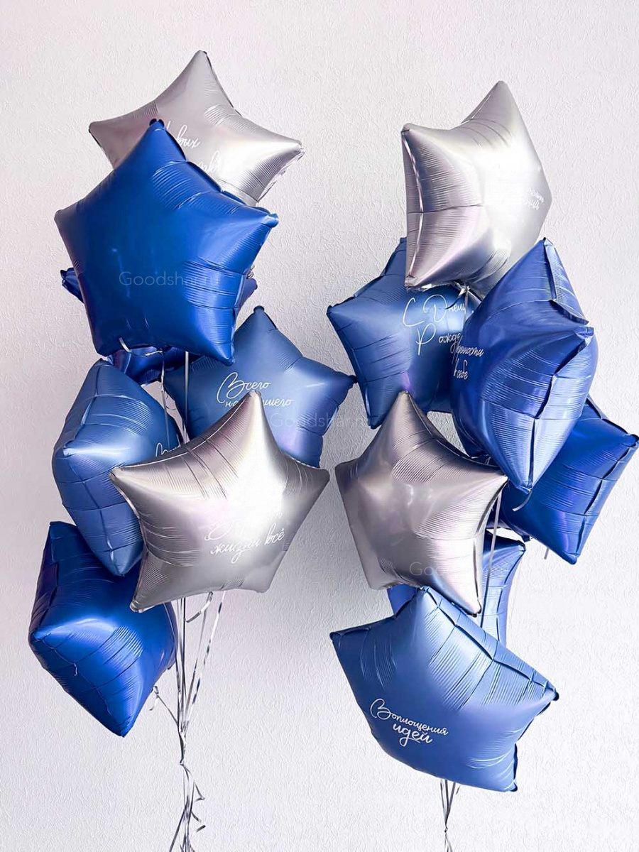 Впечатляющая композиция в глубоком синем и сияющем серебре — настоящий звездопад из фольгированных звезд. Два объемных фонтана создают эффектную многоуровневую композицию. Шесть звезд с индивидуальными надписями станут личными пожеланиями, а восемь звезд создают роскошный сверкающий фон. Подарок для мужчины, который достоин сиять ярче всех.