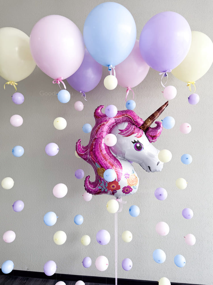 Лёгкая композиция с парящими шарами и яркой фигурой единорога.