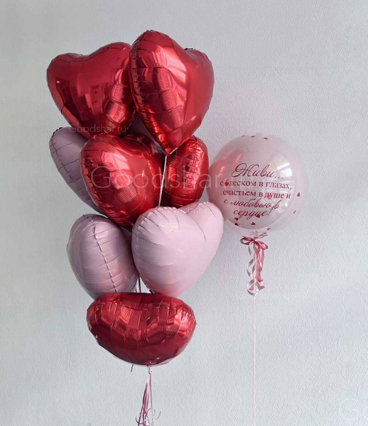 Яркая и чувственная композиция в розовых и красных тонах — словно пульс любви, бьющийся в такт сердцу. В центре внимания — стеклянный шар-гигант с индивидуальной надписью и наполнением, который станет главным посланием. Десять фольгированных сердец создают настоящий водопад любви, окружая именинницу страстью и нежностью. Идеальный выбор для дня рождения, годовщины или признания в самых сильных чувствах.