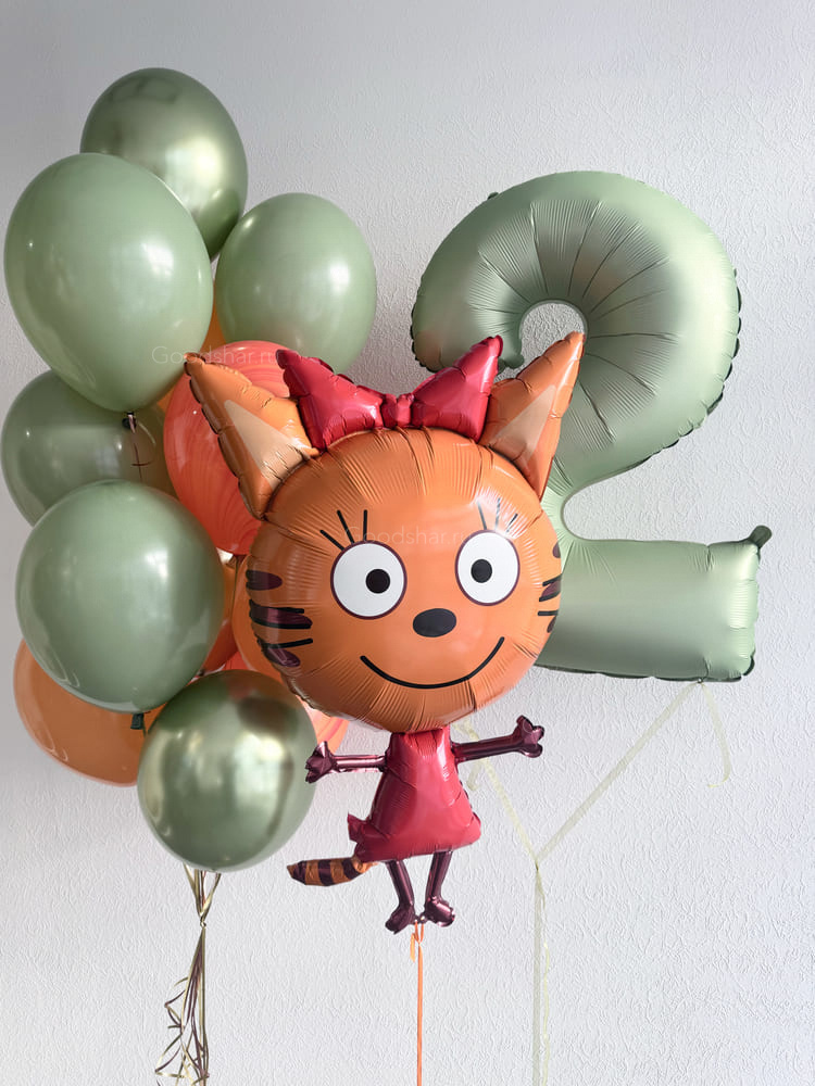 Сладкий и радостный набор для маленьких поклонников мультсериала «Три Кота». В центре внимания — фольгированный шар с любимицей многих детей — Карамелькой. Фольгированная зелёная цифра 2 подчеркнёт важность даты. Объёмный фонтан из зелёных и оранжевых шаров разных фактур (хром, матовые, агат) создаёт яркое и праздничное настроение. Идеальный выбор для дня рождения девочки или мальчика, тематической вечеринки или любого детского праздника.