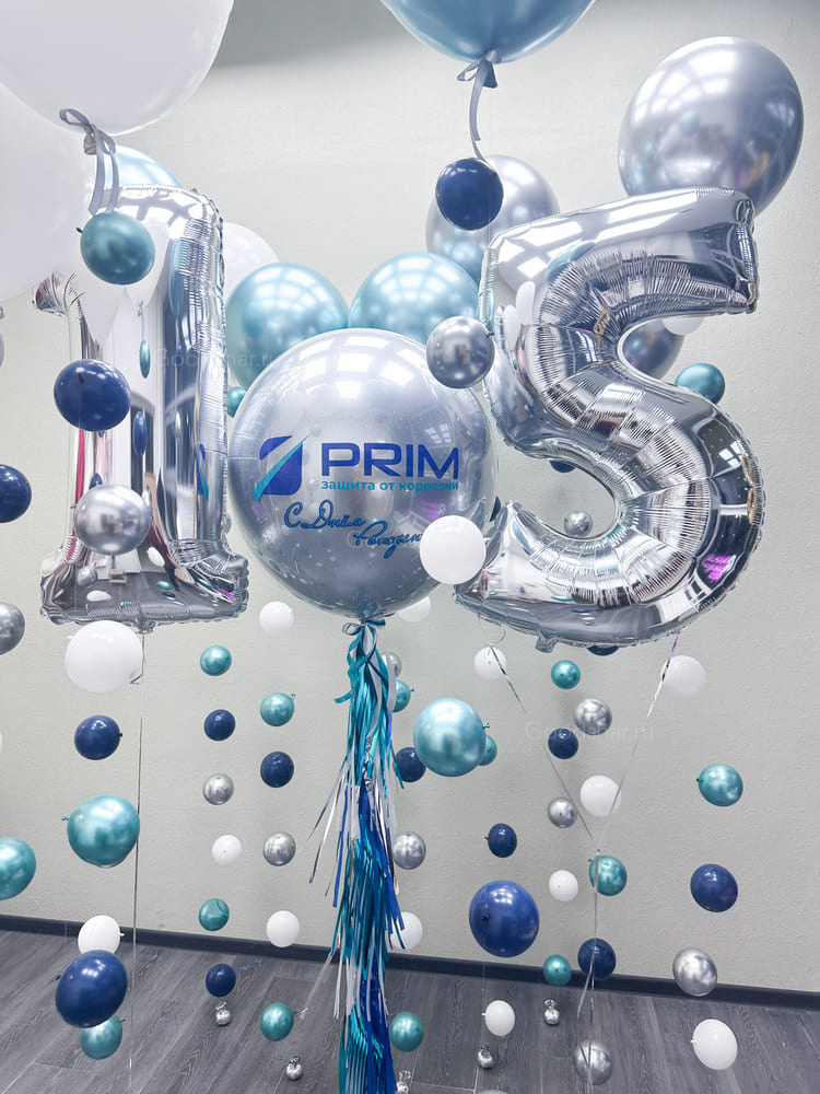 Композиция с крупным стеклянным шаром, фольгированными цифрами и воздушными цепями, создающими динамичный и современный визуальный эффект.