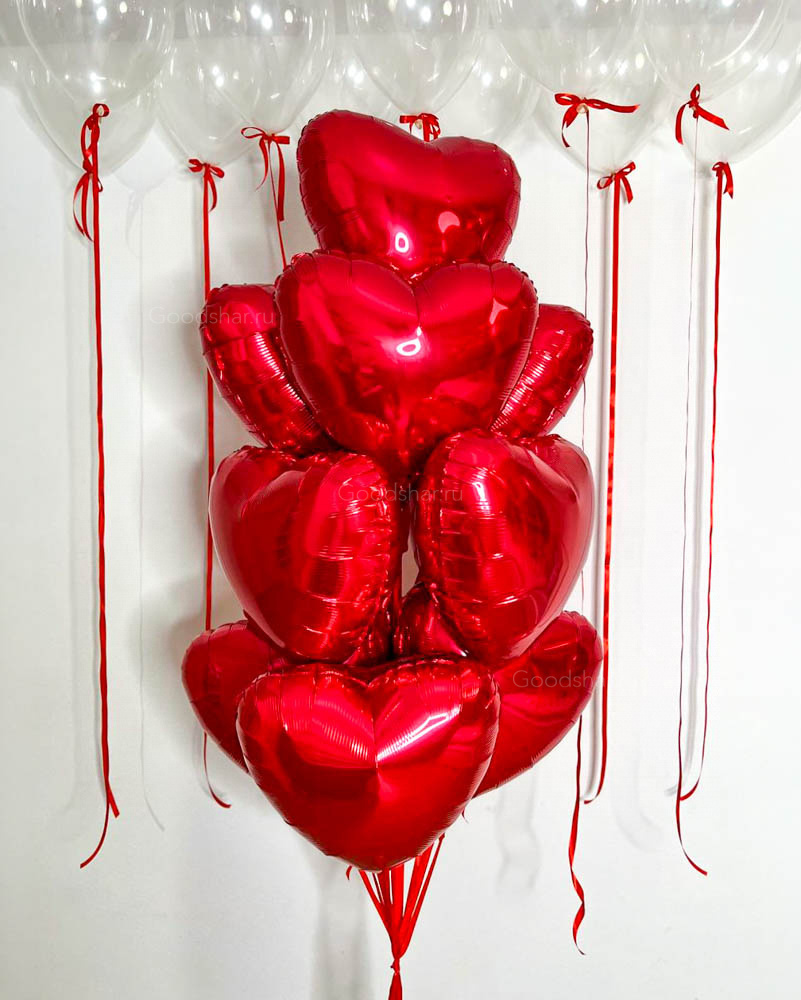 Выразительный набор с фонтаном из фольгированных сердец и шарами под потолок. Идеально подойдёт для признания в любви или создания праздничного настроения.