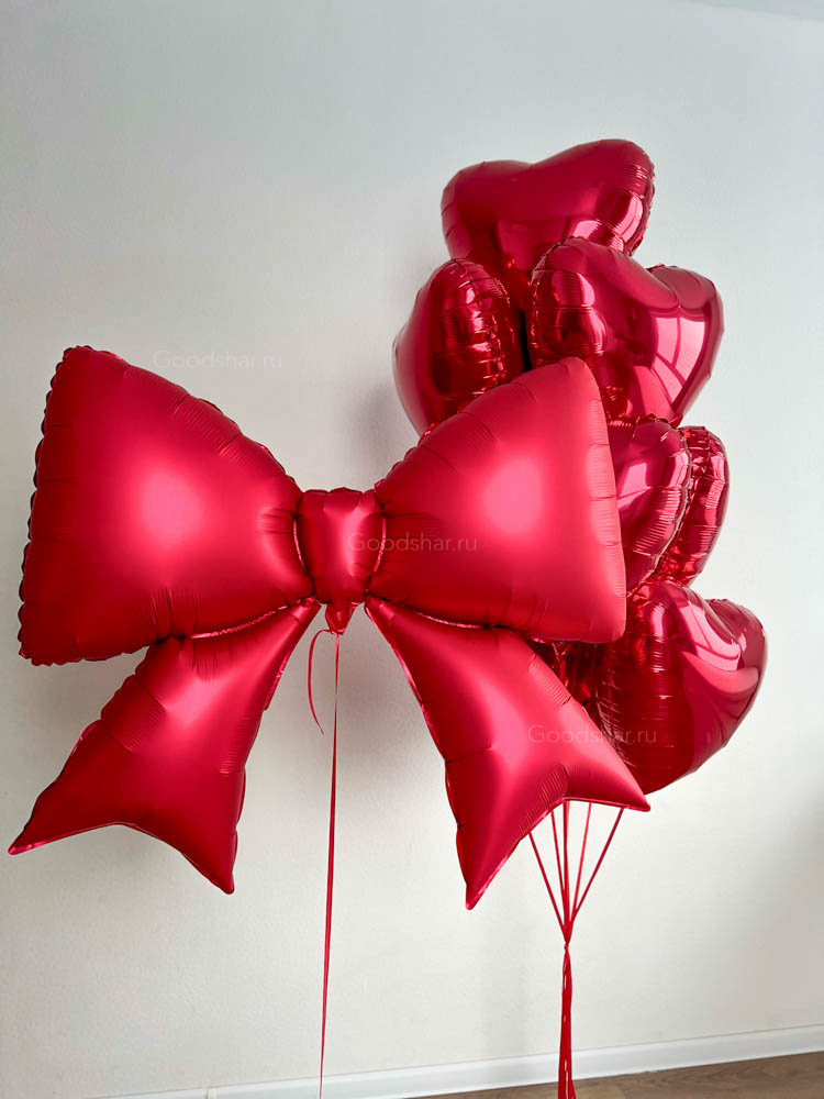 Эффектный и лаконичный набор, в центре которого — фольгированный шар в форме красного банта. Вокруг него располагаются 10 фольгированных красных сердец, создавая праздничную и романтичную композицию. Такой набор отлично подойдёт для оформления подарка, дня рождения, свидания или любого события, где нужно подчеркнуть искренность чувств.