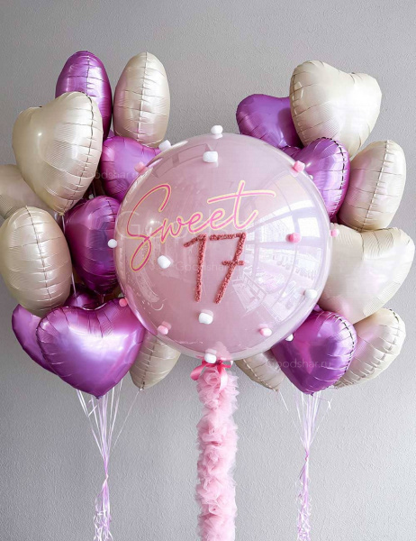 Волшебная композиция, которая переносит в мир сладостей и уюта. В центре внимания — стеклянный шар-гигант нежного розового цвета с декором в виде маршмеллоу, наклейкой, цифрой из меха и пушистым хвостом. Этот уникальный шар становится главным акцентом праздника и хранителем самых тёплых слов. Два объёмных фонтана из фольгированных шаров в фиолетовых и бежевых тонах окружают его, создавая эффект сладкого облака, сотканного из нежности и радости. Идеальный выбор для дня рождения, детского праздника или подарка для тех, кто обожает всё сладкое, нежное и по-настоящему волшебное.