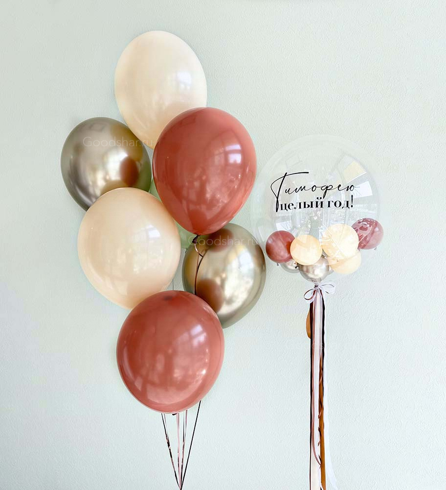 Уютная композиция в тёплых оттенках бежевого, золотого и коричневого — словно чашка ароматного чая с ложкой мёда в уютный вечер. В центре — прозрачный баблс с наполнением и индивидуальной надписью, которая сохранит самые тёплые пожелания для малыша. Латексные шары Хром добавляют медовое сияние, а матовые создают мягкость и объём. Подарок для маленького именинника, чей первый день рождения хочется согреть теплом и любовью.
