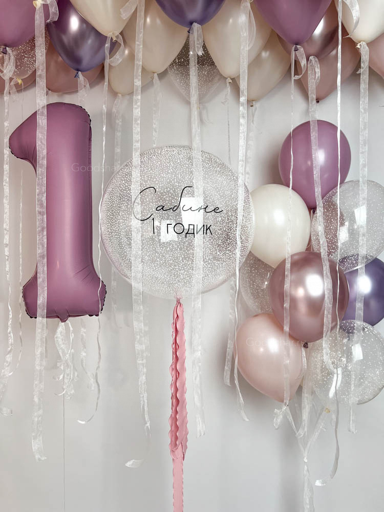Праздничный набор с бабблс с индивидуальной надписью, фольгированной цифрой, фонтаном из шаров и большим количеством шаров под потолок. Идеально подойдёт для оформления первого дня рождения и фотозоны.