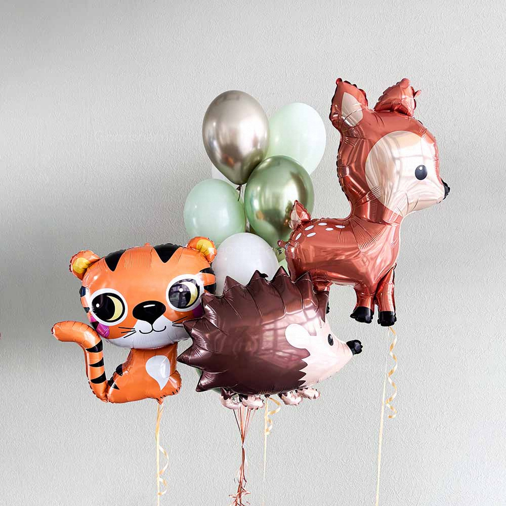Большая лесная команда в наборе «Лесные друзья №3»! Оленёнок, ёжик и тигрёнок объединились, чтобы подарить малышу радость и улыбку в его первый настоящий праздник — первый годик! Яркие фольгированные фигурки создадут сказочную атмосферу, а латексные шары хром и матовые добавят объёма и красок. Прекрасный подарок для маленького именинника!