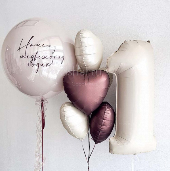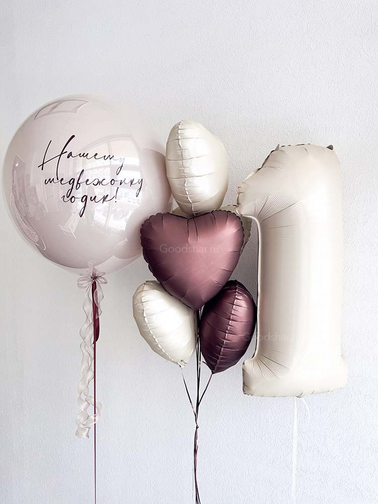 Трогательная композиция для самого родного медвежонка в его первый день рождения. В центре — стеклянный шар с индивидуальной надписью, которая сохранит самые тёплые пожелания на долгие годы. Фольгированная цифра напомнит о важной дате, а пять сердец окружают именинника любовью и заботой. Подарок, который скажет: «Ты наш самый любимый медвежонок».