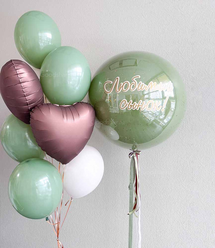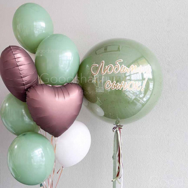 Загадочная и уютная композиция в глубоких оттенках бежевого, тёмной оливы и бургунди — словно тропинка в волшебный лес, ведущая к чудесам. В центре — стеклянный шар с наполнением и индивидуальной надписью, которая сохранит самые тёплые пожелания на долгую память. Два фольгированных сердца символизируют любовь, окружающую малыша, а латексные шары создают объём и мягкое сияние. Идеальный подарок для маленького исследователя, который только начинает свой путь.