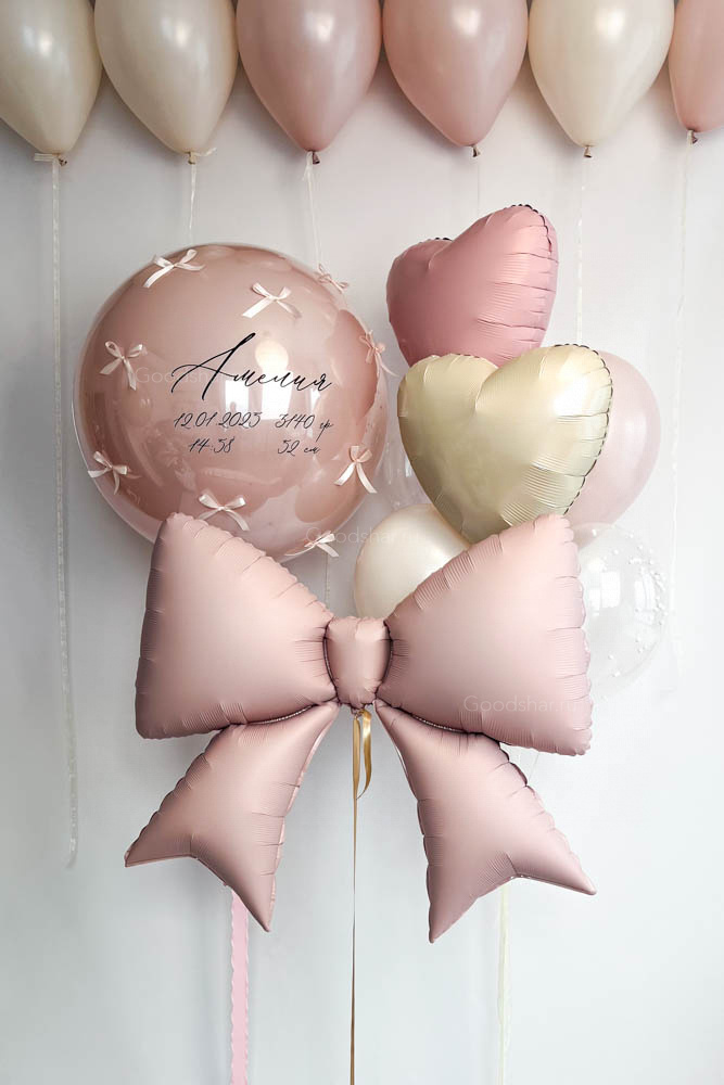 Элегантный набор со стеклянным шаром с индивидуальной надписью, декоративным бантом, фонтаном из шаров и шарами под потолок. Идеально подойдёт для создания нежной праздничной атмосферы.