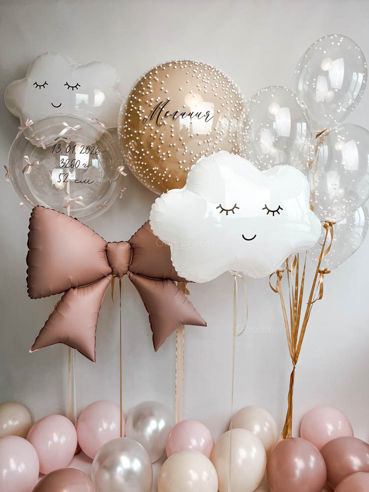 Воздушный и гармоничный набор с акцентом на стеклянный шар с наполнением и индивидуальной надписью. Композиция дополнена бабблсом с бантами, фольгированным бантом и облаками, создавая лёгкое и стильное оформление для особенного события.