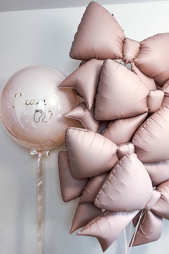 Элегантный набор со стеклянным шаром с индивидуальной надписью и объёмной композицией из фольгированных бантов. Идеальный вариант для встречи малыша или особенного подарка.