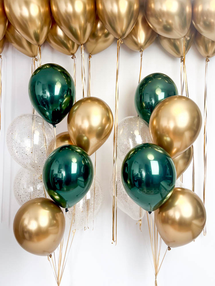 Роскошная композиция, созданная для торжественной встречи маленького чуда. Два объёмных фонтана из шаров изумрудного хрома, золотого хрома и шаров с конфетти создают эффект драгоценного сияния. Завершающий акцент — 15 парящих под потолком золотых хромовых шаров, которые наполняют пространство светом и праздничным настроением. Идеальный выбор для выписки из роддома, первого дня рождения или любого события, достойного блеска драгоценных камней.