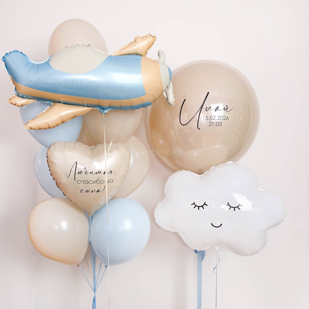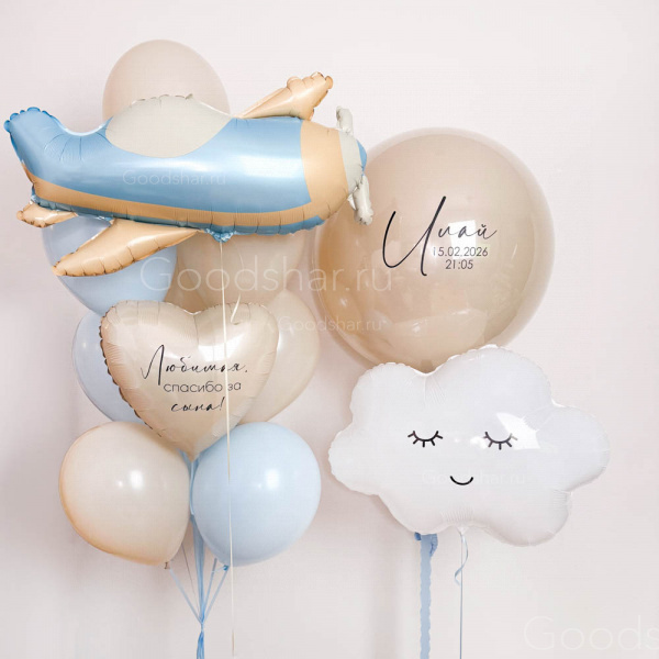 Трогательная композиция для встречи малыша из роддома, вдохновлённая первым большим путешествием. В центре внимания — стеклянный шар-гигант бежевого цвета с индивидуальной надписью, который станет главным посланием и хранителем самых тёплых слов. Фольгированные самолётик и облачко добавляют лёгкости и ощущения полёта. Объёмный фонтан из голубых и бежевых шаров с нежным бежевым сердцем создаёт атмосферу чистого неба и мягких облаков. Идеальный выбор для выписки из роддома, первого дня рождения или любого события в честь маленького путешественника.