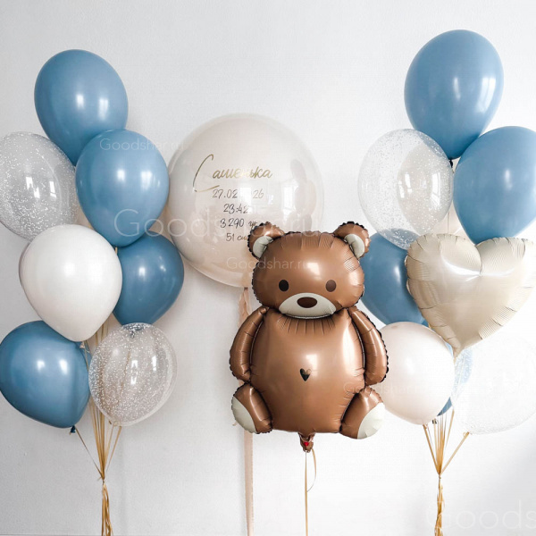 Тёплая и трогательная композиция для выписки из роддома или первого дня рождения. В центре внимания — стеклянный шар-гигант бежевого цвета с индивидуальной надписью, который станет главным посланием и хранителем самых тёплых слов. Фольгированный мишка добавляет уюта и сказочности. Два объёмных фонтана по 10 шаров в синих, бежевых тонах с мерцающими искрами и бежевыми фольгированными сердцами создают праздничное обрамление. Идеальный выбор для выписки из роддома, первого дня рождения или любого события в честь маленького принца или принцессы.