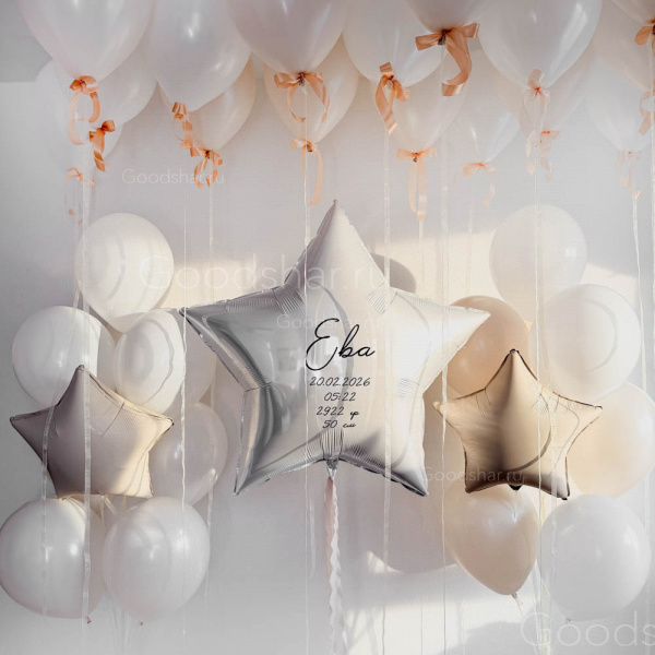 Светлая и трогательная композиция, посвящённая самому важному событию — появлению новой звезды в вашей семье. В центре внимания — фольгированный шар-гигант в форме белой звезды с индивидуальной надписью, который становится главным символом праздника. Объёмный фонтан из белых шаров и бежевой звезды создаёт сияющее обрамление, а 20 парящих под потолком белых шаров с декором наполняют пространство светом, чистотой и ощущением чуда. Идеальный выбор для выписки из роддома, первого дня рождения или любого события в честь вашей маленькой звезды.