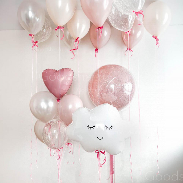 Лёгкая и трогательная композиция для выписки из роддома, вдохновлённая нежностью розового цвета и воздушной лёгкостью облаков. В центре внимания — стеклянный шар-гигант розового цвета с наполнением и индивидуальной надписью, который станет главным посланием и хранителем самых тёплых слов. Фольгированное облачко добавляет сказочности. Объёмный фонтан из розовых сердец, белых, розовых и мерцающих шаров с конфетти создаёт праздничное обрамление. 12 парящих под потолком шаров с конфетти и в нежных розовых, бежевых и белых тонах наполняют пространство лёгкостью и ощущением полёта. Идеальный выбор для выписки из роддома или первого дня рождения маленькой принцессы.