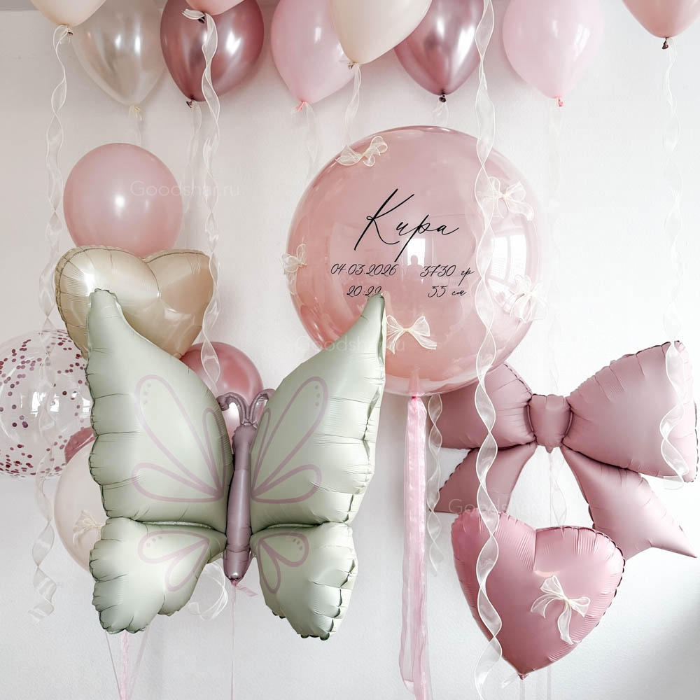 Трогательная композиция для встречи малыша, вдохновлённая пробуждением природы. В центре внимания — стеклянный шар-гигант розового цвета с индивидуальной надписью и декором, который станет главным посланием. Фольгированные фигуры — бабочка, бантик и сердце — добавляют легкости и весеннего настроения. Объёмный фонтан из латексных и фольгированных шаров в розовых, бежевых и белых тонах с мерцающими искрами создаёт атмосферу цветущего сада. Парящие под потолком шары завершают образ, наполняя пространство нежностью и радостью. Идеальный выбор для выписки из роддома или первого дня рождения малышки.