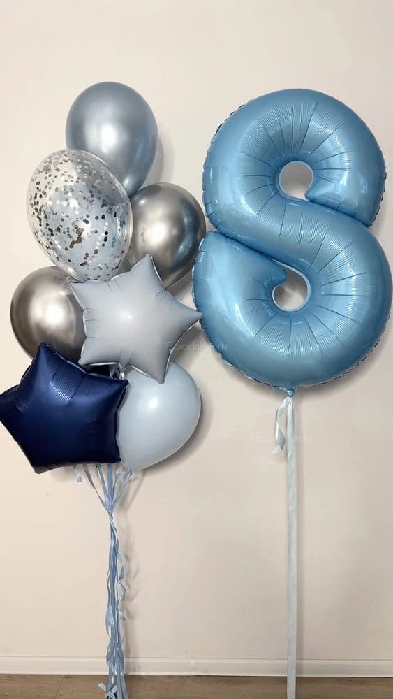 Лаконичная композиция с цифрой и шариками в холодной гамме отлично подойдёт для поздравления.