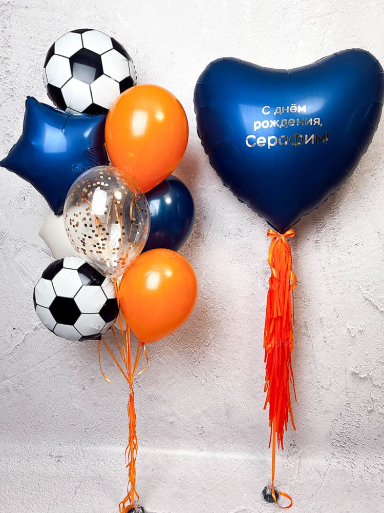Эффектный набор в футбольной стилистике для настоящего фаната и победителя. В центре внимания — синее фольгированное сердце-гигант с индивидуальной надписью, которое становится главным посланием и символом любви к игре и её герою. Объёмный фонтан из 10 шаров создаёт динамичную композицию: футбольные мячи, звёзды победы и сочные цвета футбольного поля — белый, синий, оранжевый — дополняют образ яркими эмоциями и праздничным настроением. Идеальный выбор для дня рождения футболиста, спортивного юбилея или любого события, связанного с главной игрой.