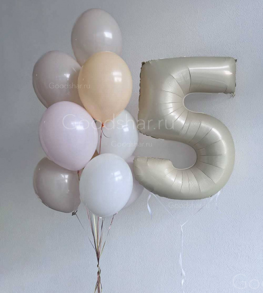 Лёгкая и элегантная композиция в пастельных тонах, словно бокал розового шампанского в окружении нежных лепестков. Фольгированная цифра «5» подчеркнёт значимость даты, а фонтан из белых, бежевых, розовых и персиковых шаров создаст атмосферу утончённой праздничности. Идеальный выбор для юбилея, дня рождения или любого события, где хочется добавить нотку романтики и шика.