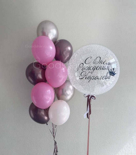 Утончённая композиция, вдохновлённая красотой и элегантностью орхидеи. В центре внимания — прозрачный баблс-гигант с индивидуальной надписью и наполнением, который хранит самые тёплые слова. Объёмный фонтан создаёт гармоничное обрамление: розовые и белые латексные шары добавляют нежности, серебряные хромовые дарят благородное сияние, а тёмно-фиолетовые придают глубину и загадочность. Идеальный выбор для дня рождения, юбилея или подарка для женщины с безупречным вкусом.