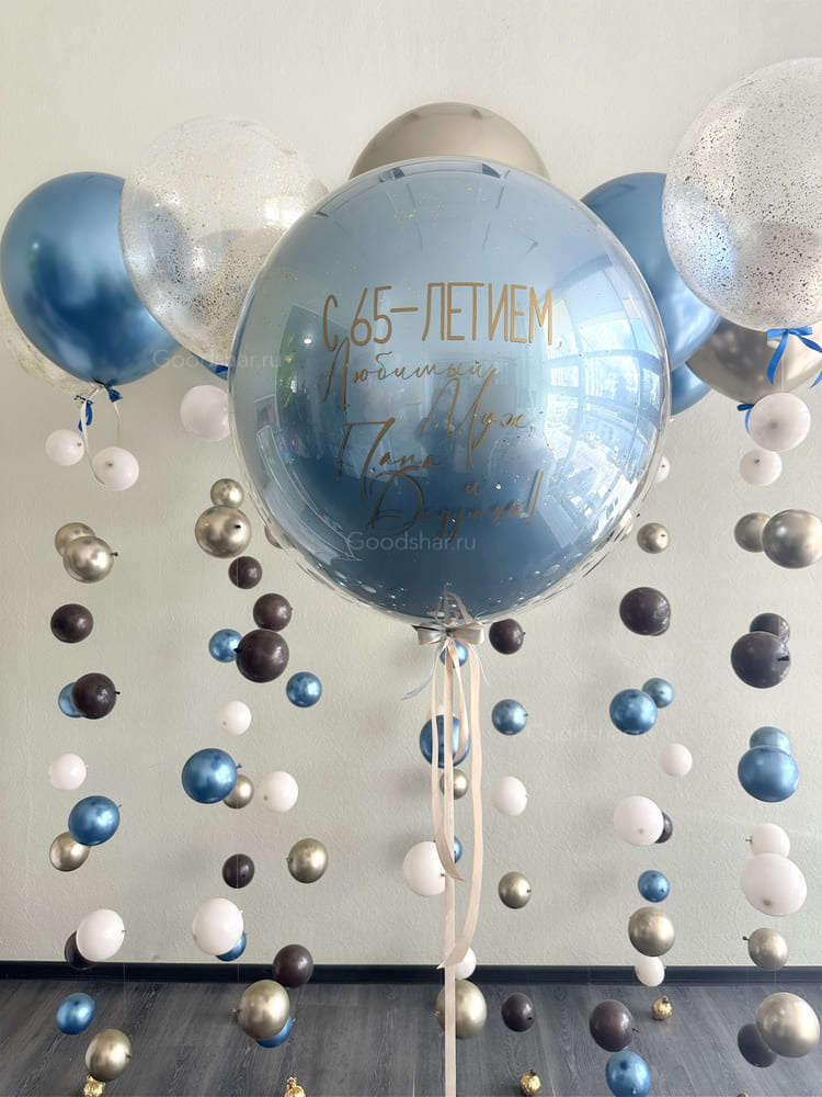 Композиция с шаром с наполнением и парящими элементами создаёт эффект глубины и лёгкости.